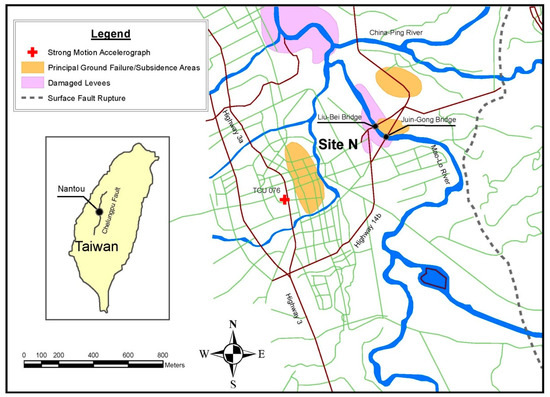 Location of lateral displacement and ground failure due to liquefaction during the Chi-Chi earthquake in the Nantou district.