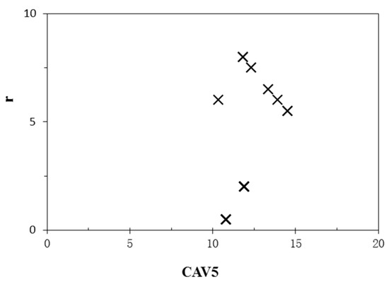 Furthermore, a statistical analysis was performed to examine and estimate the coefficient of correlation (R) of all input parameters with the output (DH) one by one. The estimated values of R for r-DH and S-DH were a positive value of 0.104 and a negative value of −0.98, respectively, contrary to the supposition for them. This was possibly due to the scarcity of sites that were explored, and consequently, the shortage measured values for r and S in the main dataset. Therefore, in this study, after eliminating r and S from dataset, only the free-face condition was considered, and samples of the ground slope condition were deleted from the main dataset. Furthermore, CAV5 was added to the dataset instead of r. Figure 4 and Figure 5 plot r versus CAV5 for range of Mw in the main dataset from 6.4 to 7 and 7 to 7.9, respectively. It should be mentioned that the bold points show more than one point coincided together.