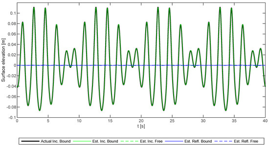 In order to validate the method and its implementation, bichromatic synthetic data were generated using the third-order theory of Madsen and Fuhrman [12,13]. The test case corresponds to “Test No. 2” in the later presented physical model tests (see Section 5). The data does not include any reflection or free harmonics. The wave gauge array used is also identical to that used in the physical model tests. The chosen phases of the two primary components are zero at x = 0.