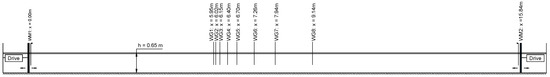 In order to evaluate the method, 2-D model tests were performed in a wave flume at the Atmosphere-Ocean Interaction Flume in Granada, Spain. The flume has a piston wave maker in each end, where one wave maker (WM1) is generating and absorbing waves, and the other wave maker (WM2) is only absorbing. The active absorption method used was the one presented by Lykke Andersen et al. [14], and the model test setup was also identical. An array of eight wave gauges (WG1–WG8) were used to test the above given reflection separation method. The method uses data from all gauges to calculate incident and reflected wave train components (amplitudes and phases). Based on the calculated components, the incident and reflected wave trains can be calculated at any point, but any errors in the mathematical model (for example, celerities) will amplify with distance from the central part of the wave gauge array. In the present paper, the time series will only be presented for x = 5.95 m (at the location of WG1). The water depth was constant throughout the length of the flume and equal to 0.65 m in all tests. The model test setup is shown in Figure 2.