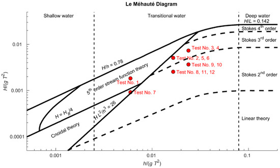 Figure 3 presents the test conditions in a Le Méhauté [15] diagram, where the data are plotted with the highest period of the two primary components and with the sum of their wave heights. In that way, the diagram should be slightly on the safe side with respect to the valid theory. It appears that third-order theory should be valid for all cases except for Test No. 1.