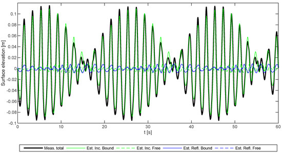 Figure 4 and Figure 5 show the incident and reflected time series for Test Nos. 2 and 5, respectively. The time series for the bound waves also include the two primary components. It appears that reflection is limited and in both cases at the order of 5%–10% of the incident wave. In the following, the focus is on analyzing the incident waves. An in-depth analysis of the reflection of the bound and free waves and a comparison to the linear absorption curve given by the Lykke Andersen et al. [14] method, is covered in detail by Lykke Andersen et al. [16].