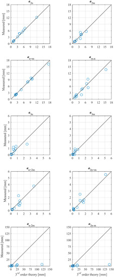 In Figure 6, the measured amplitudes from Table 3 are compared to theoretical predictions based on third-order wave theory (Madsen and Fuhrman [12,13]) using the two estimated primary amplitudes. The estimated amplitudes of the bound second-order superharmonics by the present method match accurately the ones predicted by the third-order theory. The same is the case for the subharmonic component, but more scatter is observed.