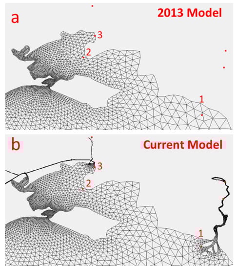 - Westerink, J.; Luettich, R., Jr.; Blain, C.; Scheffner, N.W. ADCIRC: An Advanced Three-Dimensional Circulation Model for Shelves, Coasts, and Estuaries. Report 2. User’s Manual for ADCIRC-2DDI; Army Engineer Waterways Experiment Station: Vicksburg, MS, USA, 1994; Available online: file:///C:/Users/Wei.Wu/Downloads/ADCIRC_An_Advanced_Three-Dimensional_Circulation_M%20(1).pdf (accessed on 6 February 2019).