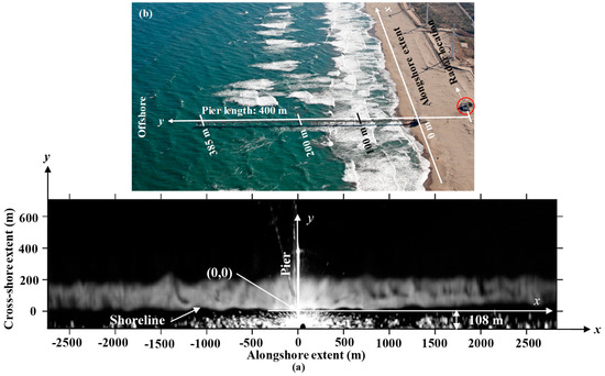 (a) The time-averaged X-band radar echo image and coordinate system (16 April 2005 at 12:00) and (b) the aerial view of the research pier. Survey data are measured along the pier from radar −110 m to 385 m.