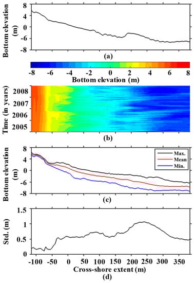 (a) An example of the beach profile variation along the pier (18 April 2005 at 7:00 am); (b) the beach profile variation during 2005–2008; (c) the mean, minimum, and maximum range of the beach profile; and (d) the standard deviation.
