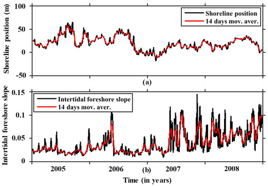 The temporal variations of (a) the shoreline positions and (b) the intertidal foreshore slopes at the research pier. The red line indicates the 14-day moving average shoreline positions and slopes.