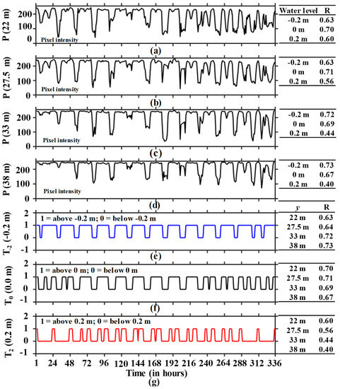 The pixel intensities over two weeks (17–30 June 2005) at m and (a) m, (b) m, (c) m, and (d) m. (e) The tidal binary signal indicating above or below water level −0.2 m: (f) water level 0.0 m and (g) water level 0.2 m. The tables on the right-hand side of a–g illustrate the correlation coefficients between the pixel intensity variation and tidal binary signals. Higher correlation values show strong similarities between pixel intensity variation and binary signal representation of tide records.