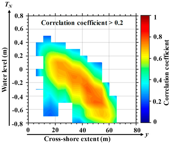 The distribution of correlation coefficients for different tidal signals (−0.8 to 0.8 m) and cross-shore positions at m during 17–30 June 2005.