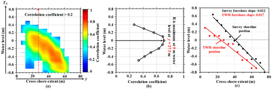 Figure 9a shows an example of the correlation map for a given longshore extent ( m) at different water levels (−0.8–0.8 m with 0.1 m increments) within the cross-shore extent (y = 0–80 m with 5.4 m increments). The red arrow line indicates an example of the cross-shore position transect at m. Figure 9b shows the correlation coefficient distribution at m extracted from the map within the water levels range (−0.5–0.4 m). The maximum correlation is established at 0.0 m water level, which is regarded as the bottom elevation of this point. Similarly, the maximum correlation at other water levels are determined among the remaining cross-shore positions, and the intertidal cross-shore profile is estimated. Then, a linear fitting model is applied to determine the shoreline position at 0.0 m water level, and the intertidal foreshore slope is calculated from regression line coefficient within the intertidal range. As shown in Figure 9c, the shoreline position is determined at m, and the intertidal foreshore slope is 0.017. Compared to the surveyed shore profile, we observed that the TWM failed to estimate the shore profile accurately from radar images.