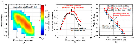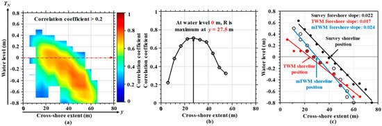 Figure 10a displays a correlation map for a given longshore extent ( m) at different water levels (−0.8–0.8 m with 0.1 m increments) within the intertidal range ( m with 5.4 m increments). The red arrow line indicates an example of a 0.0 m water level transect. Figure 10b shows the correlation coefficient distribution at a water level of 0.0 m extracted from the map within the cross-shore extent range ( m). The maximum correlation is established at the m cross-shore position, which is regarded as the bottom elevation of this point. Similarly, the maximum correlation at other cross-shore positions are determined among the remaining water levels and the intertidal cross-shore profile is estimated. Then, a linear fitting model is applied to determine the shoreline position at the 0.0 m water level, and the intertidal foreshore slope is calculated from regression line coefficients within the intertidal range. The shoreline position in Figure 10c is determined at m, and the intertidal foreshore slope is 0.024. We compared the estimated slope with a survey intertidal profile slope on 17 June 2006. Figure 10c shows that the mTWM estimated intertidal foreshore slope is very close to the survey slope; however, the extracted shoreline positions have some landward shifts compared to the survey data. This shift is induced by the effect of wave set-up or wave run-up. The correlation coefficients greater than 0.2 is used for the both cases.