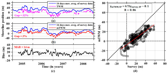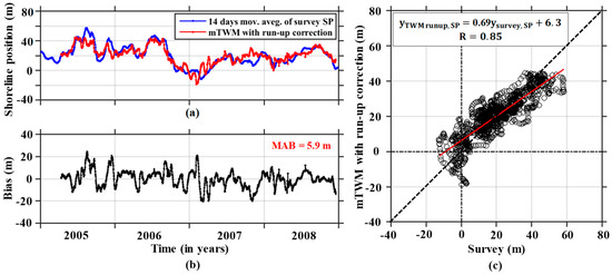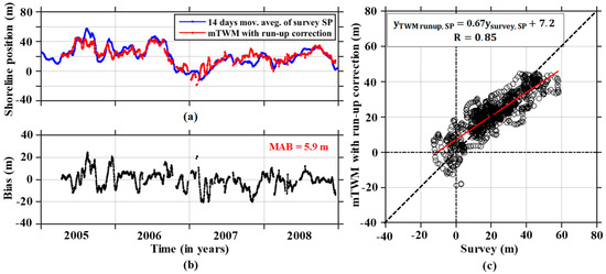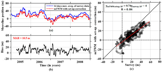 Figure 18a depicts a comparison between the survey and mTWM-extracted shoreline positions with corrected set-up, and the vertical elevation bias between the survey and mTWM results with a corrected wave set-up is shown in Figure 18b. As shown in Figure 18c, the correlation coefficient () in both cases is almost equivalent to the previously obtained results. Similar trends are observed between shoreline positions obtained by the mTWM with a corrected wave set-up and the survey data; however, the MAB of the estimated results dropped from 14 m to 10.5 m.