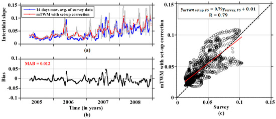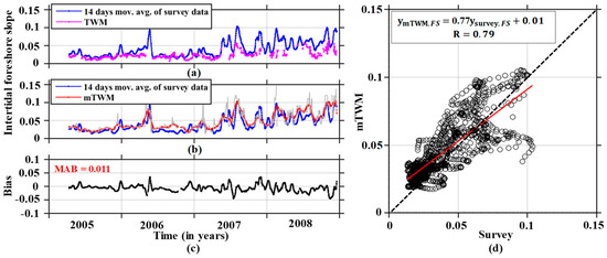 The data collected over a two-week period were processed to obtain shoreline position and intertidal foreshore slope data. This process was repeated between 12 April 2005 and 31 December 2008 to estimate variations in the shoreline position and intertidal foreshore slope. Figure 11a,b depict variations in the shoreline position derived by TWM and mTWM compared to those obtained by survey data collected at the research pier; however, some random gaps are observed owing to the lack of strong waterline signals or the saturation of echo signals. The bias between the results obtained by survey data and mTWM derived results is presented in Figure 11c, showing 14 m mean absolute bias (MAB). A similar trend is observed between the shoreline positions estimated by mTWM and the survey data, which is confirmed by the correlation coefficient (), shown in Figure 11d; however, a horizontal shift is detected between the mTWM derived results and surveyed shoreline positions. This shift is induced by the effect of wave set-up or wave run-up or by a combination of correction factors and will be discussed in Section 4.2 and Section 4.3. On the other hand, the calculated MAB between survey and TWM derived shoreline positions is 19.2 m, which is larger than the obtained MAB between survey and mTWM. The large number of random gaps also appear in the TWM estimation and are effects of linear regression conditions. This is clearly visible in Figure 11a.