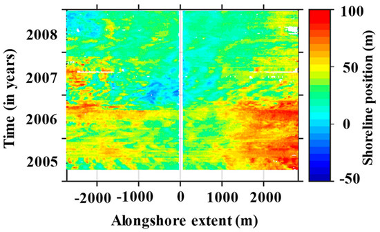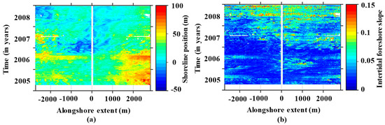 The mTWM is applied to all alongshore locations; the spatiotemporal variations in the shoreline positions and intertidal foreshore slopes for the entire area are obtained for the period between 12 April 2005 and 31 December 2008, as shown in Figure 13. The x-axis denotes alongshore extent, and the y-axis denotes the time history between 2005 and 2008. The color bar of Figure 13a indicates the landward (blue) and seaward (red) shoreline positions from its origin. On the other hand, the color bar pattern of Figure 13b shows the milder (blue) and steeper (red) intertidal beach slopes. However, 3% of the estimates are missing owing to the previously mentioned reason.