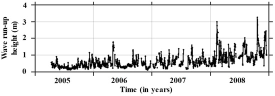 - Ruggiero, P.; Holman, R.A.; Beach, R.A. Wave run-up on a high-energy dissipative beach. J. Geophys. Res. Oceans 2004, 109, C06025. [Google Scholar] [CrossRef]