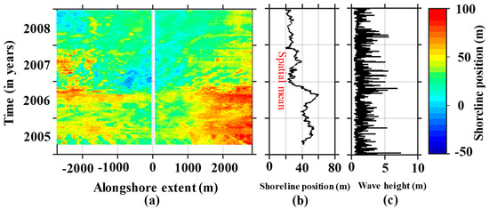(a) Gaps in the shoreline positions derived by mTWM with corrected wave run-up filled by Garcia’s smoothing and gap-filling method. (b) The spatial means of shoreline positions. (c) The temporal variations of significant wave height.
