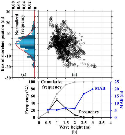 (a) The relationship between the wave height and estimated bias of the shoreline positions. (b) The frequency distribution of the wave height and corresponding MAB estimations of the shoreline positions. (c) The frequency distribution of the estimated bias of shoreline positions.