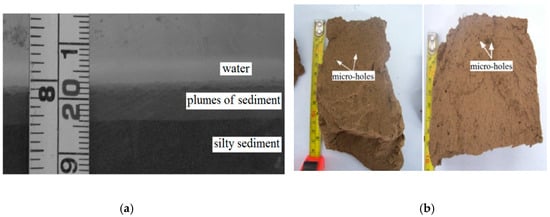 Silty sand is widely distributed in the eastern coast of China, among which the most representative area is the Yellow River subaqueous delta. According to the in-situ survey data [1], the silty sand sediment (typical median particle size less than 50.00 µm, silt content over 80%) accounts for 90% of the northeast of the delta. There commonly exists a kind of hard crust with a thickness of 2.00–3.00 m in the shallow stratum of seabeds. Sumer et al. [2] presented the results of an experimental investigation of the complete sequence of sediment behavior beneath progressive waves and reported a similar hard crust in sandy seabeds. The main reason for the formation of hard crust was thought to be the compaction or solidification of sand layers induced by waves. However, for silty sand seabeds, the coarse and fine particles coexist and the particle size distribution varies greatly. Thus, the inner mechanism becomes different and complicated. Under wave actions, fine particles filling in the pore space tend to move with the seepage flow, but the coarse particles remain in their initial positions. This characteristic has been verified by the previous work of Shi [3]. Using a scanning electron microscope, Shi [3] investigated the micro-structures of the hard crust, and found that the hard crust is constituted of uniform coarse particles and a few fine particles. Based on a lot of field and experimental tests, Jia et al. [1] pointed out that the hard crust is mainly caused by the wave-induced reformation and erosion of the sediments near the surface. As shown in Figure 1a [4], under continuous wave actions, plumes of sediment deposit over the seabed surface due to the upward movement of fine particles. Figure 1b [4] shows the micro-holes in the silty sediment as the result of fine particle transportation. This phenomenon is also named “seabed coarsening”. The seabed coarsening phenomenon commonly appears in shallow seabeds, but currently suitable theoretical or numerical models are still lacking for the wave-induced erosion process of silty sand seabeds. The coarsening phenomenon of the seabed will lead to the increase of soil permeability, which is the most important effect that can significantly affect the potential and the depth of seabed liquefaction. In addition, the mechanical properties of seabed soil will also be changed when seabed coarsening is occurred.