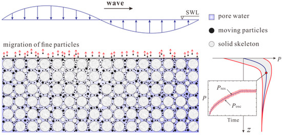 where Posc is the oscillatory pore-pressure corresponding to the elastic deformation of the soil skeleton. Posc fluctuates in both temporal and spatial domains, and the fluctuation is accompanied by the attenuation of the amplitude and phase lag under wave actions [13,14,15]. Pres is the residual pore-pressure that is period-averaged, and is the result of accumulated plastic deformation of the soil skeleton. It has been acknowledged recently that with the accumulation of pore-pressure, continuous seepage flow appears near the seabed surface and may lead to obvious particle migration [16,17,18].