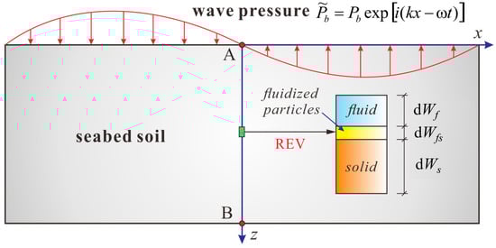 As shown in Figure 3, under the effect of wave-induced seepage, the transportation of the fine particles will be induced. In this paper, a kind of three-phase soil model is defined and used to simulate the transportation process of fine particles. The three-phase model was first proposed by Vardoulakis et al. [25] to analyze the sand production problem. Accordingly, the soil element is defined to be the combination of the soil skeleton (s), pore fluid (f), and fluidized soil particles (fs), which can be expressed as