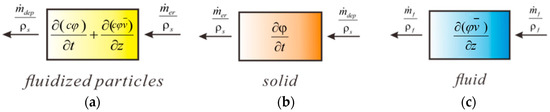 Mass conservation of the three phases: (a) Fluidized particles; (b) soil skeleton; (c) Pore fluid.