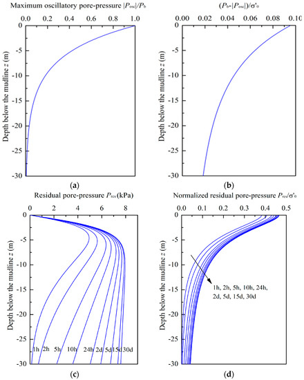 To investigate the time characteristics of the wave-induced soil erosion process, a typical wave condition case under normal sea state was analyzed in the simulation. The wave acting time t was selected as 1 h, 2 h, 5 h,10 h, 24 h, 2 d, 5 d, 15 d, 30 d (h is one hour and d refers to one day), respectively. The distributions of the oscillatory pore-pressure and the residual pore-pressure in the seabed are shown in Figure 5. As shown in Figure 5a, the dimensionless maximum oscillatory pore-pressure /Pb decreases from 1.00 on the seabed surface to 0 at the −30.00 m depth. The liquefaction of the seabed can be divided into the oscillatory and residual liquefactions [5]. According to Jeng et al. [8] and Okusa [29], the criterions of oscillatory and residual liquefactions are and , respectively ( is the effective vertical stress of soil). Figure 5b indicates that the oscillatory liquefaction will not occur under the typical wave condition. Figure 5c shows the evolution of the residual pore-pressure along depths. It is noted that the residual pore-pressure develops gradually with the extension of wave acting time and tends to be stable. The maximum value of Pres occurs at about −5 m to −10 m (below the seabed surface) depth in the whole process of wave actions. In Figure 5d, it also reveals that there is no potential soil liquefaction in the seabed with the accumulation of Pres. Under normal sea state, the soil erosion is the common behavior for the silty sand seabed.