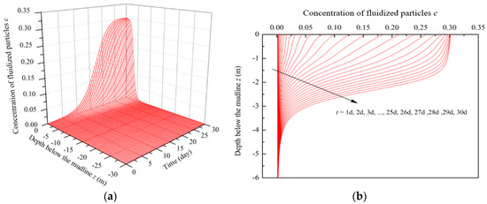 In the erosion process, part of the soil skeleton is transformed into fluidized particles, which remain in suspension under the effect of seepage flow, and thus the concentration of fluidized particles will be increased. Figure 6 shows the variations of c along depth for different wave acting times. It shows that the maximum value of c occurs on the seabed surface in the erosion process. For the shallow depth (within −2.00 m), c increases from the initial value 0.001 to the critical value 0.30 and then keeps a stable state. When the wave acting time t = 30 d, the seabed depth affected by wave-induced erosion is up to −4.00 m.