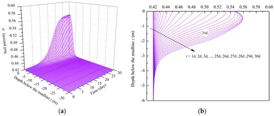 Variations of the soil porosity with the increase of wave acting time: (a) Diagram of three-dimensions; (b) diagram of two-dimensions.
