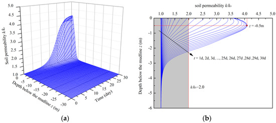 Variations of the soil permeability with the increase of wave acting time: (a) Diagram of three-dimensions; (b) diagram of two-dimensions.