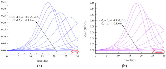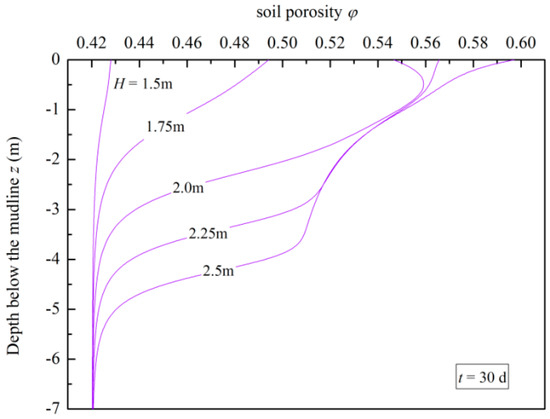 Figure 11 shows the evolution of soil porosity with wave height when t = 30 d. It can be seen that the soil porosity increases significantly at shallow seabeds with the growth of wave height. The affected depth increases from −2.00 m to −6.00 m when the wave height increases from 1.50 m to 2.50 m. It is also noted that when the wave height is bigger than 2.00 m, the soil erosion on the seabed surface develops rapidly. The effect of wave height on the erosion rate is shown in Figure 12. The soil erosion rate at shallow depths increases obviously with the growth of wave height. Similar to Figure 9b, when H equals 2.00 m, 2.25 m, and 2.50 m, a negative value of appears on the seabed surface at a certain time and then the value becomes positive later in the erosion process. It illustrates that the erosion effect plays a main role again after the deposition effect takes the lead.
