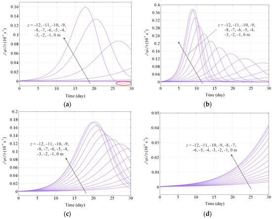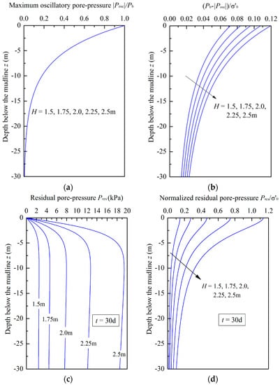 Wave height is one of the most important wave parameters, as it directly affects the wave pressure and energy inputted into the seabed [12]. To assess the effect of wave height on the erosion process, the wave height was selected as 1.50 m, 1.75 m, 2.00 m, 2.25 m, and 2.50 m, respectively. Figure 10a shows the distributions of along depth for different wave heights, which reveal is only related to soil depth and has no relationship with wave height. In Figure 10b–d, it can be seen that , , and increase obviously with the growth of wave height. Compared with the oscillatory pore-pressure, the residual pore-pressure increases more rapidly with the increase of wave height when t = 30 d. No oscillatory liquefaction occurs, and the residual liquefaction only occurs with H = 2.50 m and t = 30 d at shallow depths (within −1.80 m).