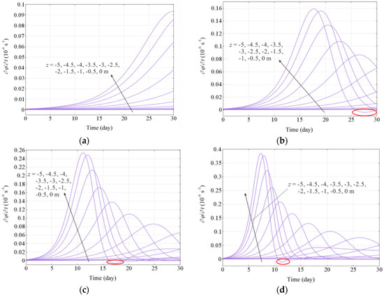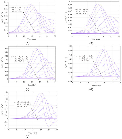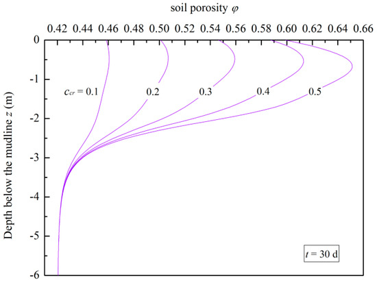 This section aims to assess the effect of critical concentration of the fluidized soil particles on the wave-induced erosion. The values of ccr were selected as 0.10, 0.20, 0.30, 0.40, and 0.50, respectively. Figure 16 gives the simulation results of soil porosity versus the depth for different ccr. It can be seen that the soil porosity increases mainly at shallow depths (within −4 m) with the growth of ccr. The soil at deep depths is not affected by ccr. The bigger the ccr, the more severe the soil erosion is. As shown in Figure 17, the erosion rate is obviously affected by ccr at shallow depths. Combined with Figure 17a–e, it can be seen that the peak values of for the selected depths increase obviously and reach the peak values later with the growth of ccr. Furthermore, the value of becomes negative in the later stage of the erosion process when . It can be concluded that the bigger the ccr, the more remarkable the deposition effect.