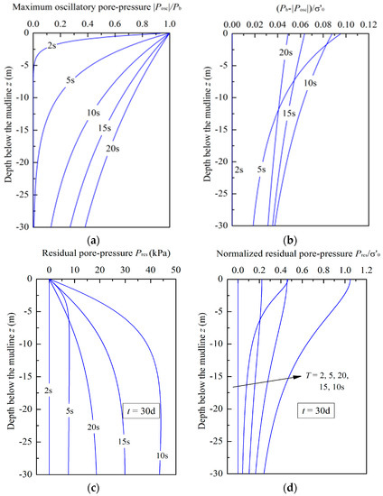 The wave length is always related to the wave period and water depth [12]. In this section, the effect of wave period on the wave-induced erosion was studied. The wave period was selected as 2 s, 5 s, 10 s, 15 s, and 20 s. The responses of the pore-pressure for different wave periods are plotted in Figure 13. Figure 13a clearly shows that the maximum value of oscillatory pore-pressure and the affected depth increases significantly with the extension of the wave period. The responses of , and for different wave periods are shown in Figure 13b–d, respectively. These three physical quantities first increase and then decrease. There is a competition mechanism between the accumulation and the dissipation of the residual pore-pressure. For the waves with bigger periods, the dissipation of residual pore-pressure becomes relatively obvious. Therefore, there exists a particular wave period corresponding to the maximum residual pore-pressure. The oscillation liquefaction will not occur due to always being less than 0.1, and the residual liquefaction appears on the seabed surface when wave period T=10s.