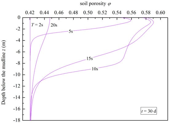 The wave period has obvious effects on the soil porosity (Figure 14). The affected depth increases greatly when T>5 s. For the soil within the affected depth in the seabed, its porosity increases with the extension of wave period first, and then shows a decreasing trend. The soil erosion is not obvious with a small or big wave period and there exists a particular wave period to make the soil erosion most severe in the seabed. For wave period T = 2 s, the soil porosity almost equals the initial value, but the soil porosity increases most obviously when T = 10 s. Figure 15 shows the variations of for different wave periods. When T = 10 s, the values of at different depths reach the peak values fastest and the peak values are the biggest compared with the other wave periods. This wave period leads to the fastest wave-induced erosion in the seabed.