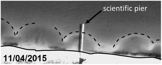 Around 10% of sea coasts have underwater bars []. The timescale of longshore bar formation and movement can vary from days to months []. According to laboratory experiments [], under weak or moderate waves, the underwater bar moves shoreward until it joins the coast and disappears. Stronger waves switch the direction of the bar movement seaward. With changing wave conditions, the underwater bar can stay approximately at the same place and be considered stable [].