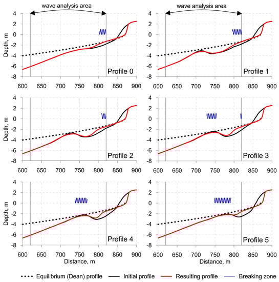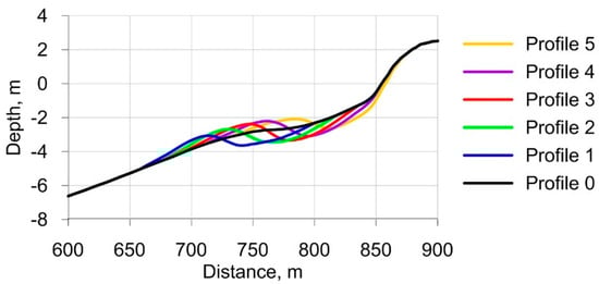 Figure 3 shows the underwater bottom profiles, both initially and the result of 20 h storm modelling. The resulting deformations of the underwater profile are presented in Table 2. The change in all of the beach profiles was characterized by erosion in the splash area, the transition of material seaward, and its accumulation at depths of more than 1 m. However, the activity of erosion and accumulation processes on profiles with different bar locations varied.
