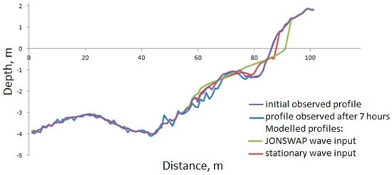 The validation of XBeach, which has been made by developers and users, shows that this package can be successfully used in non-hydrostatic mode with the default settings []; however, some studies have shown that XBeach overestimates coastal erosion [], which we also noticed from our analysis of the field data and the modelling results. For study site conditions, we tested XBeach with stationary and non-stationary (Joint North Sea Wave Project Spectrum - JONSWAP) wave inputs, and compare these with the synchronous observations carried out during field experiment <Skorpilovtsy-2007> (Figure 3). The results could be considered reasonable.