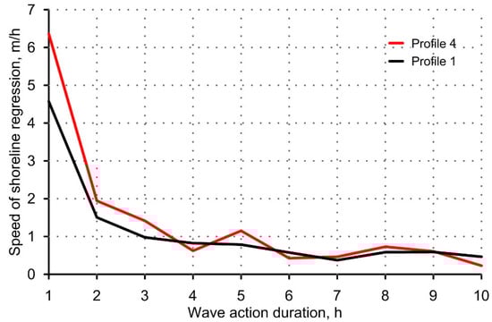 The process of the retreat of the coastline and the transformation of the coastal zone relief occurs non-uniformly over time. Figure 6 shows the changes in the coastline retreat speed after 10 h of wave action, for profiles with maximum (4) and minimum (1) changes. The fastest shoreline retreat was observed during the first hour of the storm for all profiles: it varied from 4.5 to 6.5 m/h. Erosion activity slows down over time. After 6 h of wave action, the beach profile adapts to the specific waves occurring, and assumed a relatively equilibrium state. The shoreline regression rate became ≈0.5 m/h, and it remained approximately the same for all profiles.