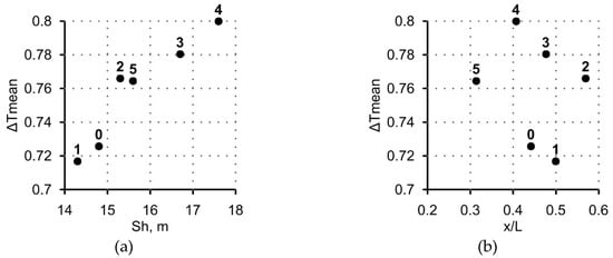 Dependence of (a) shoreline retreat (Sh, m) and (b) the relative distance of seaward sediment transport (x/L) on the relative change in the mean wave period (ΔTmean, s) occurring during wave transformation over a barred profile (620–820 m, see Figure 4). L is the wavelength calculated for deep-water conditions, and x is the distance of maximal sediment transportation away from the shore.