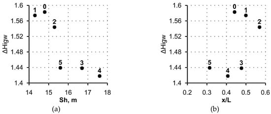 Dependence of (a) the shoreline retreat (Sh, m) and (b) the relative distance of seaward sediment transport (x/L) on the relative change in significant wave height (ΔHs, m) occurring during wave transformation over barred profile (620–820 m, see Figure 4). L is wave length calculated for deep water conditions, x is distance of maximal sediments transport away from the shore