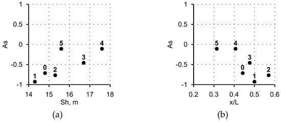 Dependence of (a) shoreline retreat (Sh, m) and (b) the relative distance of seaward sediment transport (x/L) on wave asymmetry (As) after wave transformation (near the shore, at the x-coordinate 820 m). L is the wavelength calculated for deep-water conditions, and x is the distance of maximal sediments transported away from the shore.