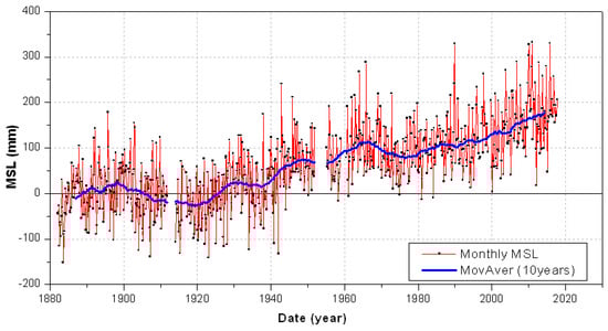 A 10-year period moving average (Figure 2, in blue) is superimposed to the main series (Figure 2, in red), from which sea level rates and velocities for different time periods can be evaluated. From 1920 to 2000, a mean rate of 1.94 mm/year was estimated for the Cascais SLR (155 mm in 80 years), while a rate of 1.6 mm/year (±0.02 mm/year) was estimated by linear regression (LR). The later estimation is compliant with the global SLR (GSLR) rate estimation generally proposed for the 20th century [11]. After the decade of 1970, the SLR rate at Cascais TG exhibited a constant increase, reaching the 2.1 mm/year in the century transition. This increase in SLR rate has continued and, based on the satellite altimetry data series, one can observe a global mean rate of 3.3 mm/year, from 1992 to 2016 [2,12], with a slight rate increase over the past years, mainly since 2007 (Figure 3), denoting the beginning of an SLR accelerating process [13]. For the same period (1992–2016), a 3.1 mm/year rate was observed for the Cascais TG and a 3.0 mm/year rate for the North Atlantic MSL anomaly obtained by CNES data center.