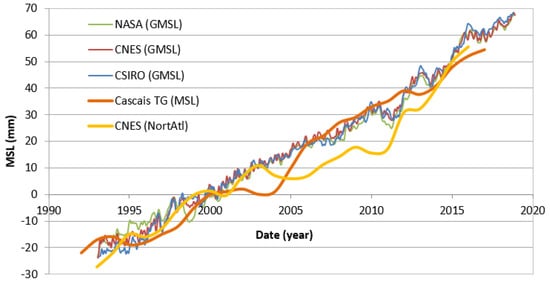 Considering satellite GMSL data series from the three international satellite altimetry data centers, NASA, CNES, and CSIRO, a weighted average SLR rate of 3.26 mm/year (±0.01 mm/year) was obtained for the period of 1993 to 2016 and of 4.28 mm/year (±0.04 mm/year) for the recent period of 2007 to 2016 [18]. Based on the satellite altimetry MSL anomaly calculated from 1993 to 2009, a global SLR of 3.4 ± 0.4 mm/year was obtained. Other authors have used these values as a reference [2,13], however, [18] refers that the obtained error is mostly due to the uncertainty in the altimeter drift TG calibration, and that formal errors based on point-to-point uncertainty, or the variance of residuals, are typically lower than 0.1 mm/year, which is in agreement with the errors obtained in the study (Table 2).