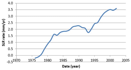 From the secular time series, an SLR rate of 2.1 mm/year was estimated for the century transition, which can be assumed as the rate at the beginning of the 21st century. However, other rates can be estimated from different numerical methods and different ranges of data, namely, from a sequential numerical velocity computed through a numerical running differentiation.
