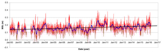 Using the refined daily MSL series from 2000 to 2016 (Figure 5), corrected from the inverse barometric effect and local vertical displacement observed by spirit leveling, and additionally reduced from mean seasonal oscillation, different SLR rates can be estimated by linear regression. Applying the bootstrapping technique, SLR rates for five time periods applied to Cascais MSL series, from 1992 to 2004, and from 2000, 2001, 2003, and 2005 to 2016, are obtained (Table 1). The increasing rate values obtained for the successive periods, ranging from 2.2 mm/year (±0.07 mm/year) to 4.1 mm/year (±0.14 mm/year), show evidence of an accelerated relative SLR observed at Cascais TG, which was also demonstrated by [13] with satellite altimetry data.