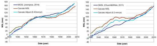 MSL of Cascais (in mm), modeled by a 20-years moving average of the secular series (Figure 2), adjusted to the GMSL from [9] by a rate of 0.43 mm/year (left graph) and fitted to the GMSL from [10] by a rate of 0.2 mm/year (right graph), both with rotation points at epoch 2000 and an adequate vertical shift to overlay the curves.