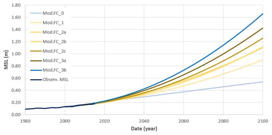 The Cascais and WCPM projections were denominated as FCUL (Faculty of Science of the Lisbon University) models and represented by the acronyms Mod.FC_0, Mod.FC_1, Mod.FC_2, and Mod.FC_3 (Figure 7). They were obtained by estimation models applied to Cascais TG data and, additionally, to East North Atlantic satellite altimetry MSL anomaly (NASA data center), near the WCPM, and to North Atlantic region (CNES), reduced with the estimated uplift velocity. Based on the observed regional MSL series and on different SLR acceleration estimates, these projections can be considered as the best relative SLR estimates for this region.