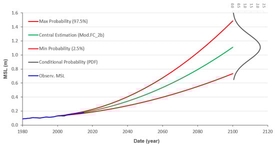 The probabilistic SLR projections, shown in Figure 12, can be compared to any global or regional model in order to estimate the respective exceeding probability. For instance, the SLR of RCP4.5 and RCP8.5 [1] at epoch 2100, in this probabilistic projection, corresponded to an exceeding probability of 88.4% and 74.5%, respectively, while the RCP2.6, concerning closely to Mod.FC_0, corresponded to a 92.5% of exceeding probability. On the other end, the used NOAA (National Oceanic and Atmospheric Administration) GSLR high-end projection models [19] (2 and 2.5 m of SLR), concerning to the presented PDF of the absolute SLR, corresponded to very low values of exceeding probability, 0.4% and 0.004%, respectively.