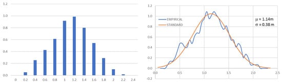 From each of the seven estimated projection models (Figure 7), an ensemble of n projected SLR probability curves, with a 5% of the interval, varying from 5 to 95%, with additional tail probabilities of 1 and 99%, can be generated. In total, an ensemble of 147 probabilistic projections was obtained, from which the relative frequency was analyzed and fitted to a normal probability density function (Figure 9). Based on the histogram of the relative frequency of MSL ensemble projections for 2100, it was possible to adjust a PDF function to the empirical relative frequency of the SLR projections ensemble for 2100. Figure 9 shows the histogram of the ensemble distribution (left) and the PDF adjusted to the empirical relative frequency (right).