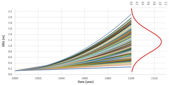 With a different approach and based on the RCP8.5 scenario [25], it reached a similar PDF result for a GSLR projection for 2100. On comparing the high-end probability results of [25], the GSLR of 1.8 m obtained for the 5% of exceeding probability is very similar to 1.77 m obtained in this study. While in the present study, such absolute SLR of 1.8 m corresponded only to 1.7% of exceeding probability.